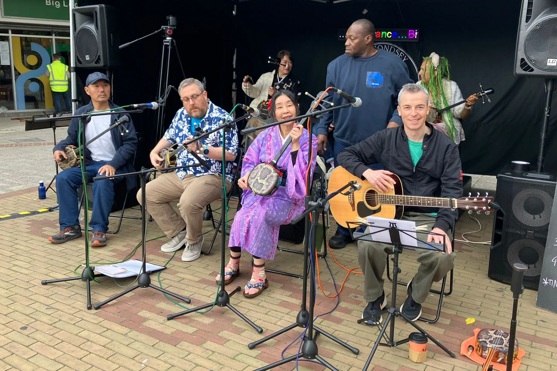 A few of us from Sanshinkai played at the Bermondsey Folk Festival on Saturday. It was the first time it had taken place since 2019, and it was a low-key event this time. We played some music from Okinawa, with me doing a quick instrument switch from sanshin to guitar for Warabigami and back again for the next piece, then I played guitar accompaniment for a set of songs from Amami, which was formerly part of Okinawa, but was ceded to Japan in the 17th century and has evolved a distinct culture. In particular, they play the sanshin with a different type of plectrum and tuned about a third higher.