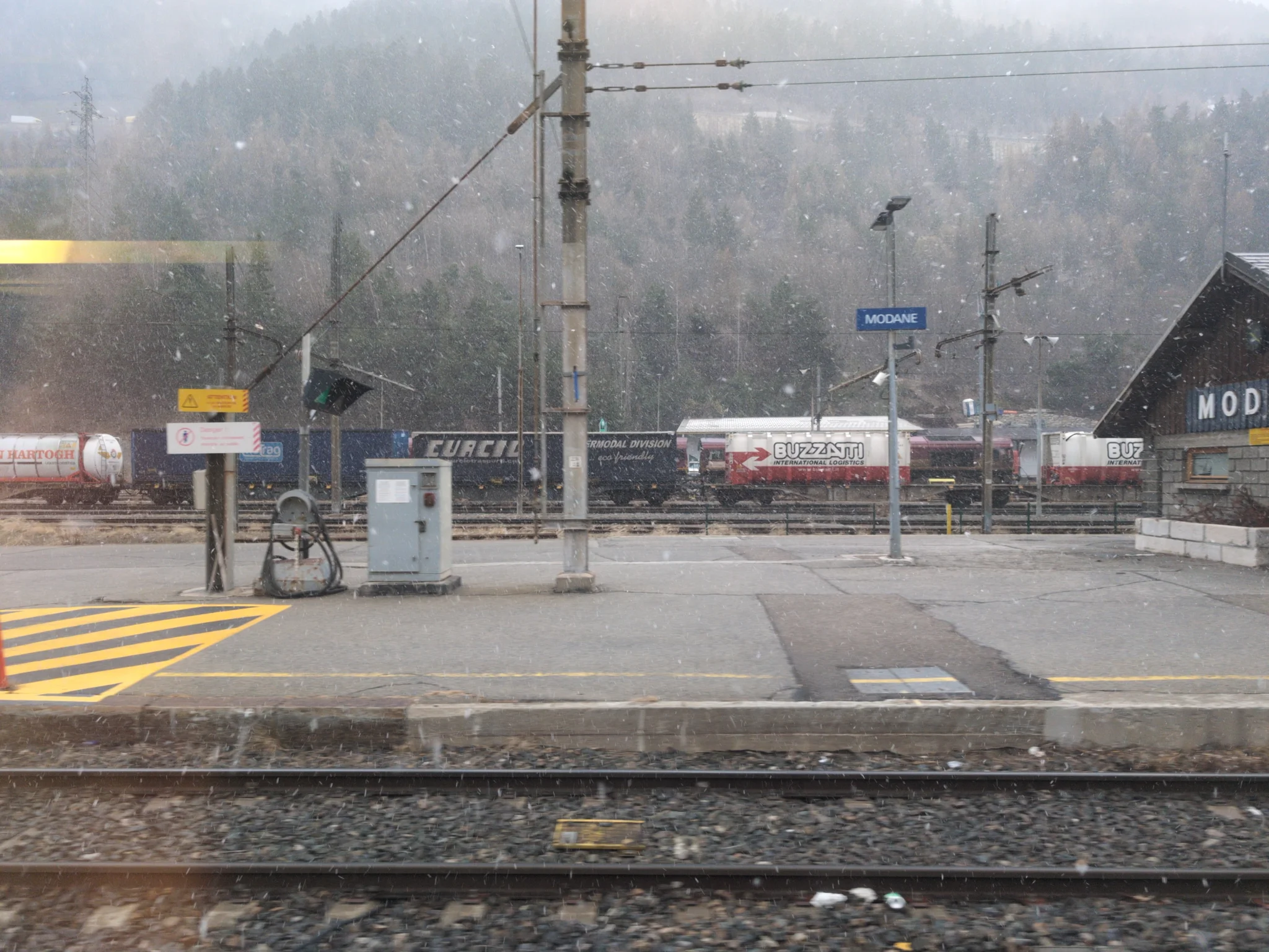 The TGV gets as far as Lyon rapidly, but then spends hours crawling across the Alps on slow lines. We left London in the sunshine, but up in the prematurely crepuscular shadow of the mountains it was snowing.