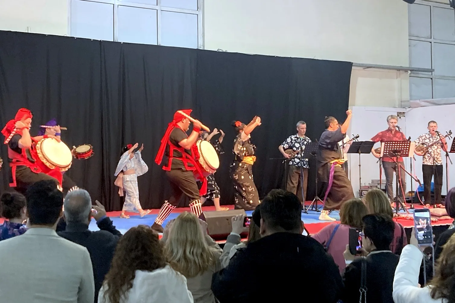 Our performance went well. Everyone knew what they were doing, nothing broke, and the audience seemed to enjoy it. The taiko players didn’t bring the bulky drums from London, but instead borrowed a couple from a Japanese percussion group in Athens. Unfortunately, Japanese taiko drums are designed for static use, rather than being carried by dancers, and these were about twice as heavy as they were used to! They managed, but I don’t think it was fun for them.