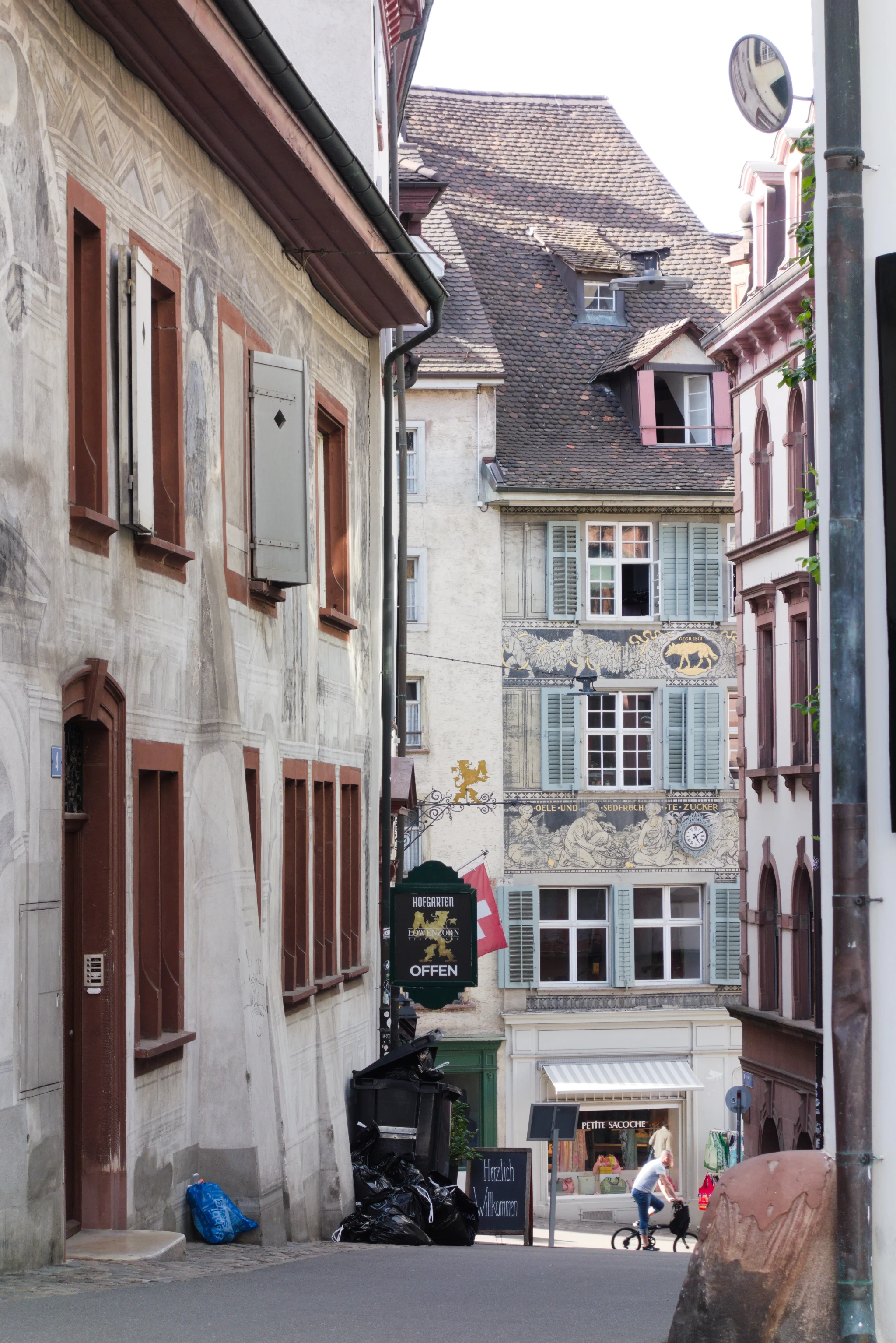 A street in Basel. The elaborate illustrations on the building include a number of racial caricatures of the kind that wouldn’t be made today.