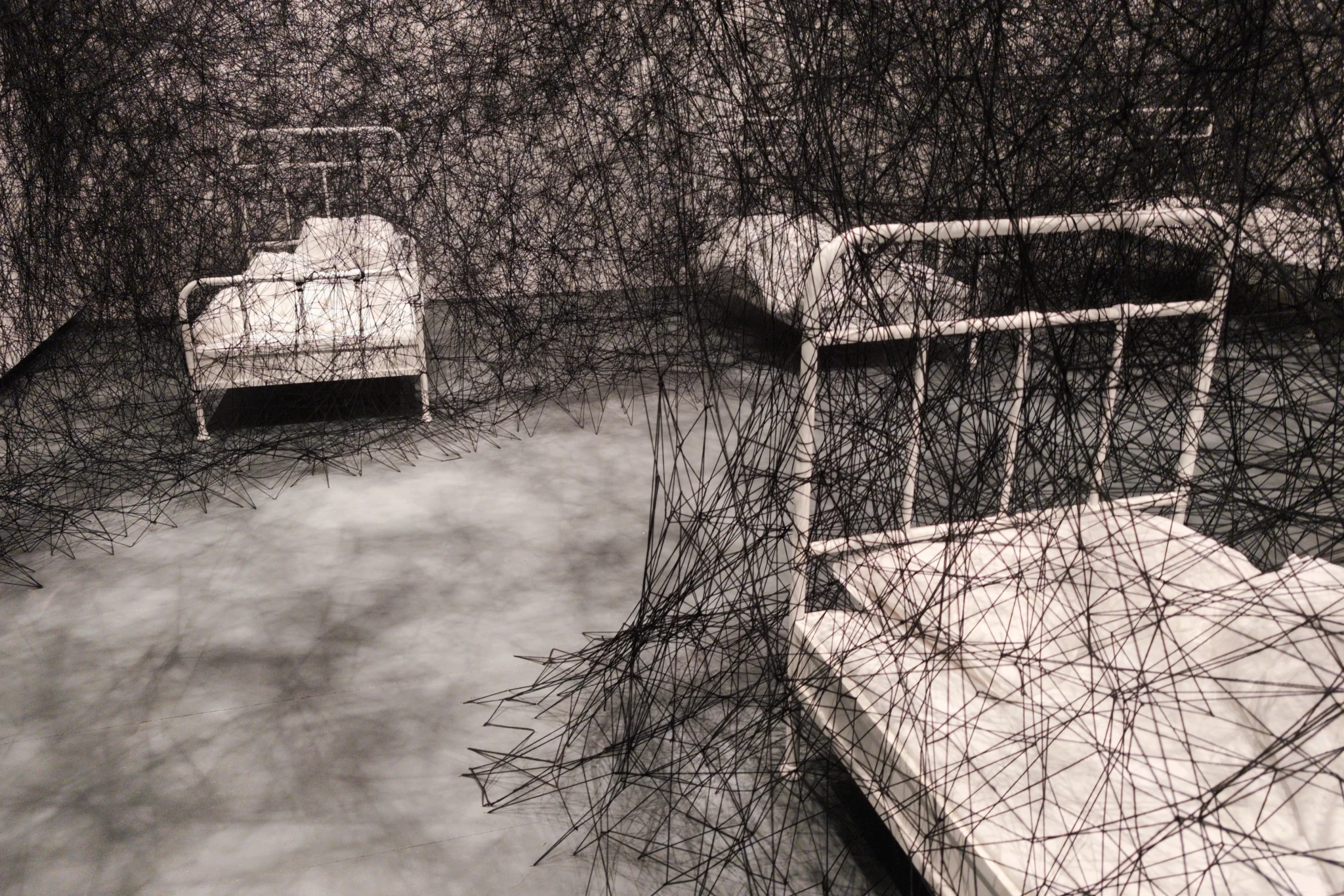 Pictures can’t capture the sheer amount of thread in Chiharu Shiota’s installation. It’s like several cat’s cradles, each the size of a room, and had me puzzled just trying to work out how you’d even construct such a thing.